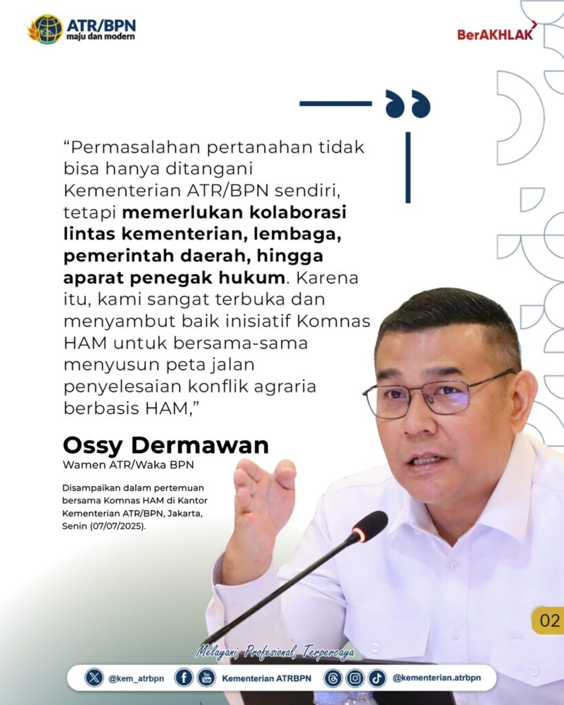 Ossy Dermawan, menegaskan komitmennya untuk memperkuat penyelesaian konflik agraria dengan pendekatan berbasis Hak Asasi Manusia (HAM), melalui pelibatan berbagai pihak terkait secara inklusif. Hal ini ia sampaikan dalam pertemuan bersama jajaran Komisi Nasional (Komnas) HAM di Kantor Kementerian ATR/BPN, Jakarta, Senin (07/07/2025).